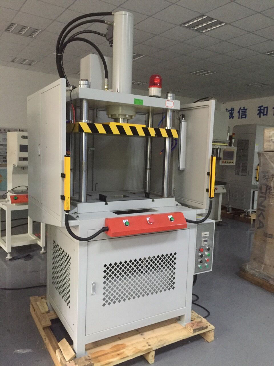 Standard features include an emergency stop button, safety guard, and hydraulic overload protection